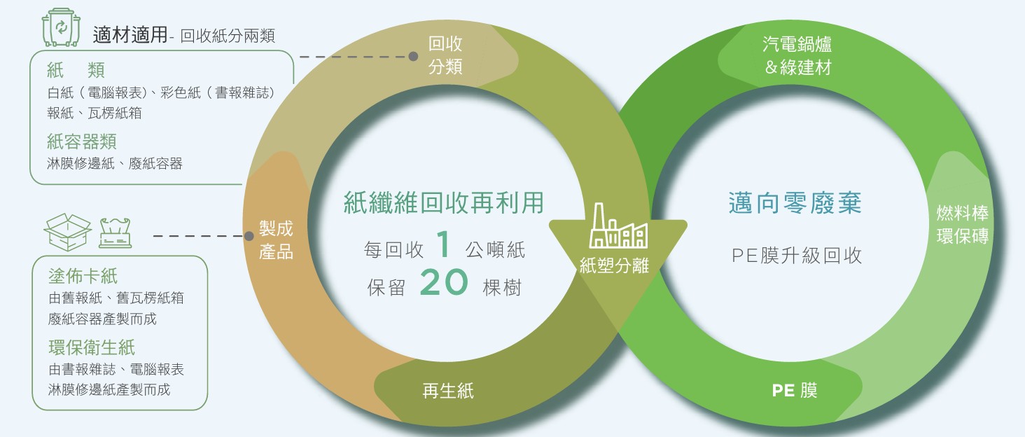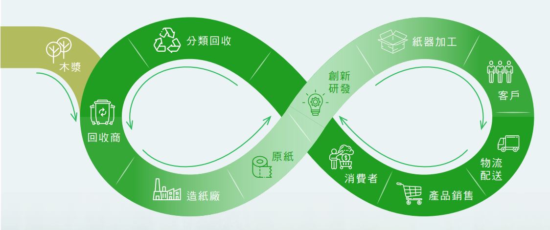 透過產品生命週期:原料使用、產品設計、綠色生產、物流配送,到最終端的消費使用,以「再生資源─造紙─包裝」的循環經濟模式,近年積極透過S.M.A.R.T.(Subtraction 資源減用、Material 轉廢為能、AI 產銷智能、Recycling 回收再生、Technologies 先進製程)低碳智紙五大策略,整合產品、能源、水3大資源全循環,將傳統工廠打造為更環保的智慧再生工廠。