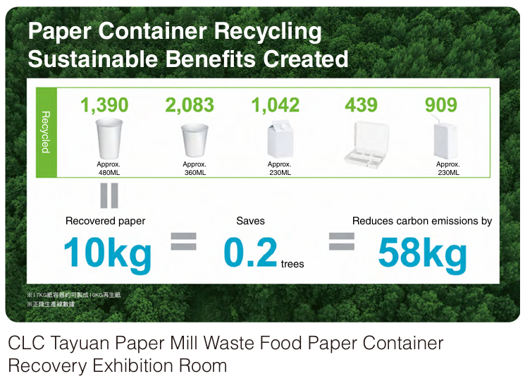 CLC advanced waste food Paper container recovery by installing a 66,000 tonnes recovered bleached pulp line at Tayuan Paper Mill in 2023. By the end of 2024, ChuPei Paper Mill's certified processing volume for food paper containers was approved by the government, increasing by 50% to 3,000 tonnes per month. The group's total certified annual processing volume for waste food paper containers reached 176,000 tonnes, enabling the recovery of over 50% of Taiwan's waste food paper container resources and achieving a carbon reduction of 1.02 million tonnes. CLC engaged associations, schools, government agencies, and enterprises through diverse collaborations to expand carbon reduction impact and opened its factories for public visits to raise awareness of sustainability responsibilities.