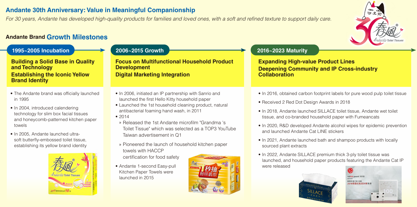 CLC entered the Taiwan household paper market in 1993 and launched the Andante brand in 1995. Following the 2004 acquisition of Baolong paper mill, CLC introduced the Lover, Dandelion, and Snow Soft brands, establishing a comprehensive product line covering toilet tissue, facial tissue, kitchen towels, and hand towels. ChuPei Paper Mill implemented Taiwan's first automated household paper warehouse, Asia's first million-tonne wind power system, and Taiwan's largest high-efficiency biomass cogeneration system. By integrating R&D center resources and academic collaboration, CLC developed high-value extraction and low-carbon diversified products to meet various needs.