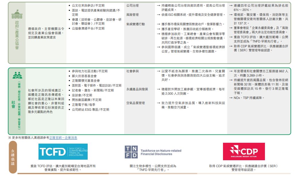 正隆藉由本報告書回應六大利害關係人關注議題,並透過官網和多項平台揭露相關資訊,促進與利害關係人正向交流。正隆ESG委員會每年向董事會報告與利害關係人溝通情形,2023年度議合成果已於2024年3月12日提報董事會,相關內容如下: