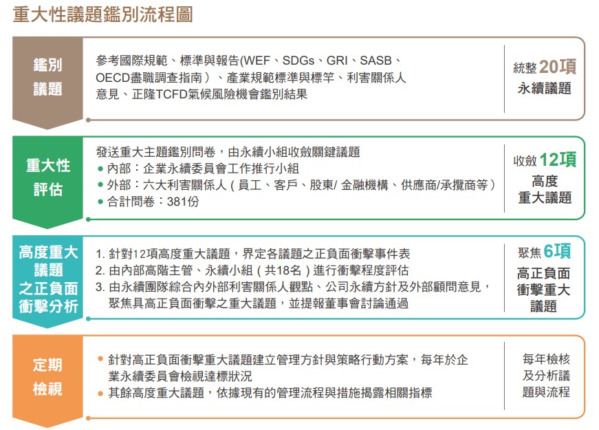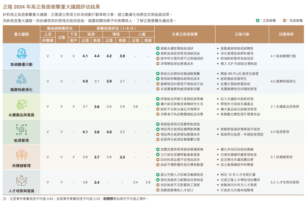 正隆蒐集利害關係人及內外部專家關注議題,檢視利害關係人分類及其關切議題之合適性予以調整。2024年向內外部利害關係人發送重大議題鑑別問卷,針對20項正隆永續議題進行評估,將「對正隆」以及「對經濟、環境、人群」皆有顯著衝擊的議題定義為「高度重大議題」,並由永續小組收斂為12項,繪製重大性議題矩陣。接著由永續團隊及外部專家針對高度重大議題,界定其對於經濟、環境及人群(含人權)三面向之正負面衝擊事件表,由內部高階主管與永續小組成員就事件影響之規模、範疇進行影響程度及發生可能性之評估;正面衝擊事件應考量事件如何帶來財務或營運效益,負面衝擊事件則考量事件如何等對公司造成不良影響,如財務減損或營運衝擊,最終由永續團隊綜合內外部利害關係人觀點、公司永續方針及外部永續顧問意見,聚焦6項高度正負面衝擊議題, 包含氣候變遷行動、能源管理、廢棄物資源化、永續產品與發展、供應鏈管理和人才培育與發展,重大議題鑑別與衝擊分析結果經提報董事會討論通過。