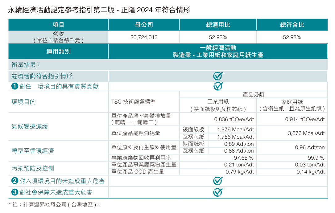 專注循環再生商業模式,正隆以低碳紙與紙板及紙箱的製造、加工與服務為核心業務,綠色永續營收占比超過95%。 透過一張紙為市場提供貼近自然且多元化的綠色消費選擇。 依據台灣永續經濟活動認定參考指引—第二版,正隆公司以循環經濟進行紙與紙板的生產,符合「一般經濟活動」類別之永續經濟活動認定。本公司台灣2024年營收為307.2 億元,其中,永續經濟活動總適用與總符合比重分別達 52.93%、52.93%,適用類別為綠色低碳工業用紙(裱面紙板與瓦楞芯紙)與家庭用紙(含衛生紙,且為原生紙漿)之生產製造,經盤點後,全數符合三大永續經濟活動:(一) 對任一環境目的具有實質貢獻、(二)對六項環境目的未造成重大危害,包含氣候變遷減緩、氣候變遷調適、水及海洋資源的永續性及保育、轉型至循環經濟、污染預防與控制, 以及生物多樣性保育及復育等永續指標,以及(三)對社會保障未造成重大危害。正隆積極應對氣候變遷、提升資源循環效率、減少環境負荷與空氣品質管理,真正實踐永續循環經濟。