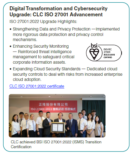 - CLC established the ISO 27001 Information Security Management System (ISMS) in 2023 and completed ISO 27001:2022 transition certification in June 2024. CLC continues to allocate resources, adhere to ISO 27001 standards, and drive innovation and management upgrades to enhance information security.XRefine the information security management system. In August 2023, the company achieved ISO 27001:2013 ISMS certification through the British Standards Institution (BSI) and obtained the ISO 27001:2022 transition certification in June 2024. Using the PDCA cycle, the company conducted a digital asset inventory and risk assessment, reviewed the effectiveness of information security goals and related measures, and implemented improvements accordingly.