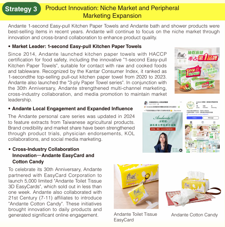 In 2024, CLC launched the Dandelion Eco Convenient Pack Toilet Tissue and the Locally Extracter Personal Care Series by Andante to advance low-carbon, plastic-reduced, and nature-based solutions. In 2025, for the 30th anniversary of the Andante brand, CLC will introduce box facial tissues made entirely of paper without lamination. These initiatives promote daily sustainable practices and reinforce CLC's long-term commitment to sustainability.