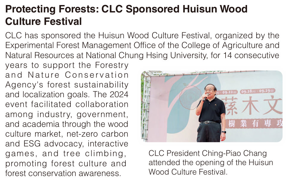 CLC aligned with the 65th anniversary goals of "Nature Sustainability, Paper towards Net Zero" and supported the United Nations Global Plastics Treaty draft by launching eco weed control paper made from 100% locally recovered paper in 2023,and obtained the Ministry of Agriculture's organic agricultural material certification for 2 consecutive years (2023~2024).