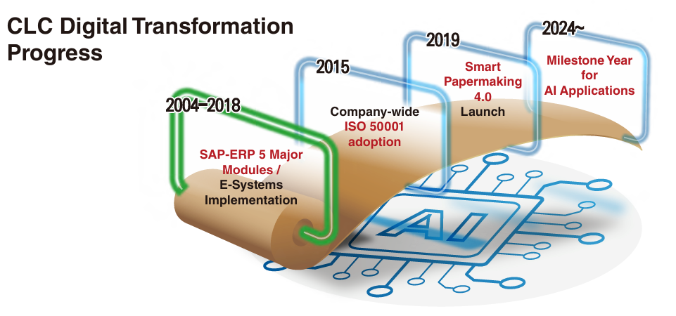 Amid global market shifts, CLC advanced digital and intelligent transformation to enhance competitiveness. In 2004, CLC completed group-wide ERP implementation. From 2012 to 2017, CLC developed the cogeneration energy digital system at Houli Paper Mill, a digital procurement platform, and a household paper CRM system. In 2019, CLC launched the "smart papermaking 4.0" project, integrating equipment, implementing energy-saving and carbon reduction monitoring, and automating management to improve production efficiency and reduce labor dependence. CLC became the 1st in the papermaking industry in Taiwan to implement intelligent production and sales, accelerating the transition to low-carbon operations.