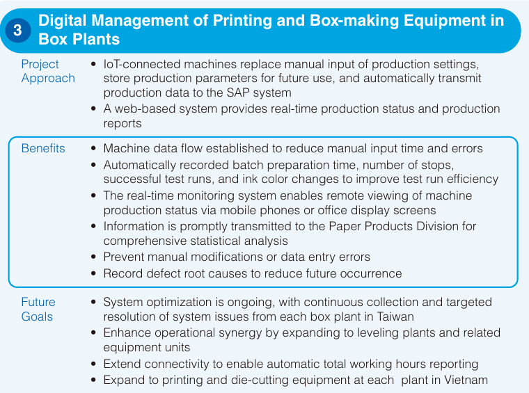In response to rapid AI development, CLC designated 2024 as the Milestone Year of AI applications, building on a foundation of automation, digitalization, and intelligent data. In 2024, CLC implemented 4 AI projects: an in-house GPT system to enhance administrative and HR efficiency, RFID pallet management at box plants, digital management of printing and box-making equipment at Taiwan box plants, and PI system planning at Binh Duong Paper Mill in Vietnam. Since 2019, CLC has completed 29 AI projects under smart papermaking 4.0, advancing process digitalization and intelligent optimization. CLC continues to expand smart papermaking 4.0 to include AI smart manufacturing for the Vietnam Binh Duong paper machine and cogeneration system to improve energy efficiency and carbon reduction. We keep integrating digital inspection systems across all mills/plants to achieve seamless online smart manufacturing and offline digital inspection. Real-time data collection and analysis are optimizing production processes, increasing equipment efficiency, strengthening quality management, and reducing energy consumption. CLC continues to upgrade the ISO 27001 information security management system (ISMS) to enhance information security for industrial control systems.