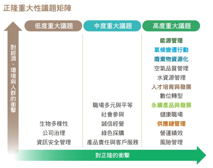 正隆蒐集利害關係人及內外部專家關注議題,檢視利害關係人分類及其關切議題之合適性予以調整。2024年向內外部利害關係人發送重大議題鑑別問卷,針對20項正隆永續議題進行評估,將「對正隆」以及「對經濟、環境、人群」皆有顯著衝擊的議題定義為「高度重大議題」,並由永續小組收斂為12項,繪製重大性議題矩陣。接著由永續團隊及外部專家針對高度重大議題,界定其對於經濟、環境及人群(含人權)三面向之正負面衝擊事件表,由內部高階主管與永續小組成員就事件影響之規模、範疇進行影響程度及發生可能性之評估;正面衝擊事件應考量事件如何帶來財務或營運效益,負面衝擊事件則考量事件如何等對公司造成不良影響,如財務減損或營運衝擊,最終由永續團隊綜合內外部利害關係人觀點、公司永續方針及外部永續顧問意見,聚焦6項高度正負面衝擊議題, 包含氣候變遷行動、能源管理、廢棄物資源化、永續產品與發展、供應鏈管理和人才培育與發展,重大議題鑑別與衝擊分析結果經提報董事會討論通過。