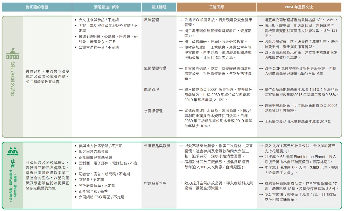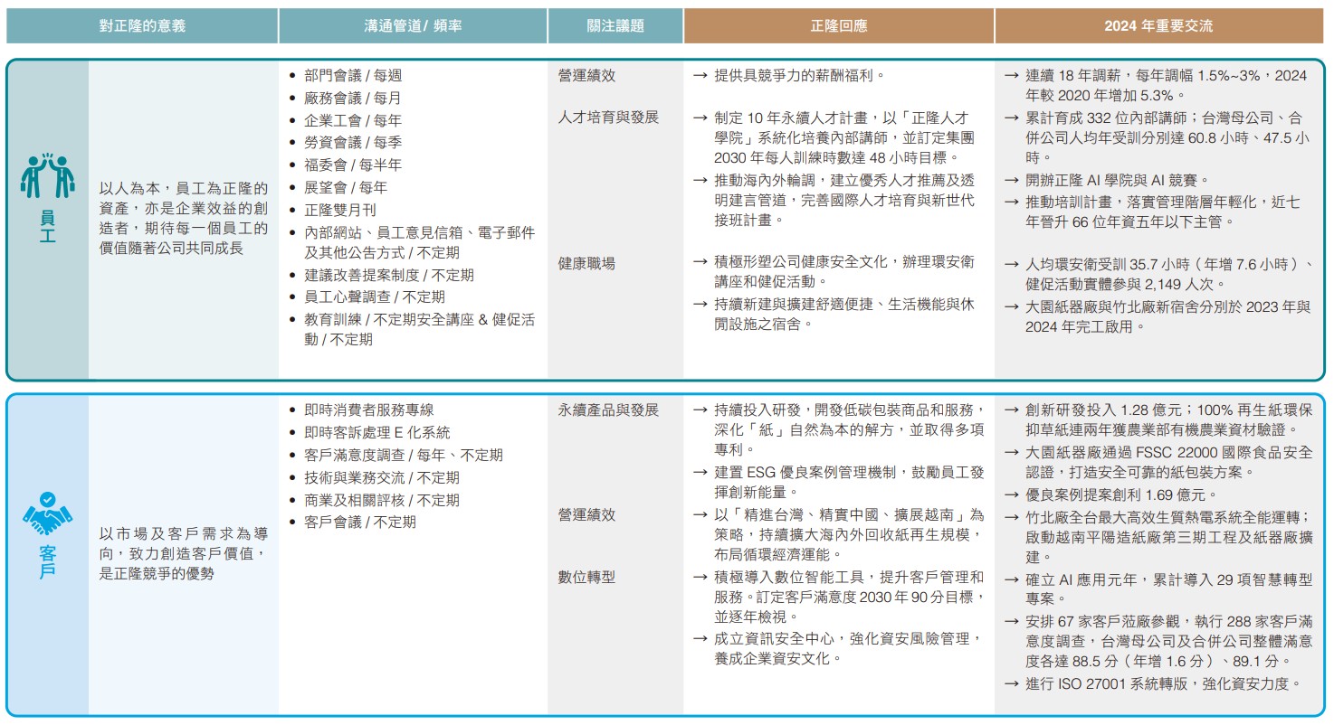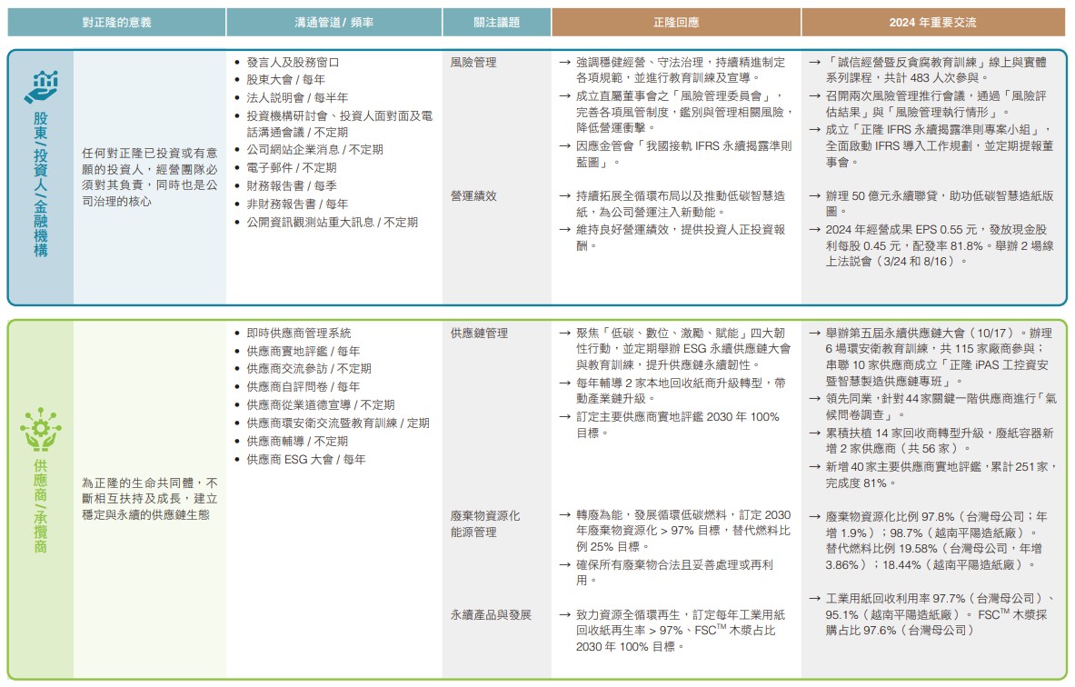 正隆藉由本報告書回應六大利害關係人關注之高度重大議題,並透過官網和多項平台揭露相關資訊,促進與利害關係人正向交流。正隆企業委員會每年向董事會報告與利害關係人溝通情形,2024年度議合成果已於2025年3月12日提報董事會,相關內容如下: